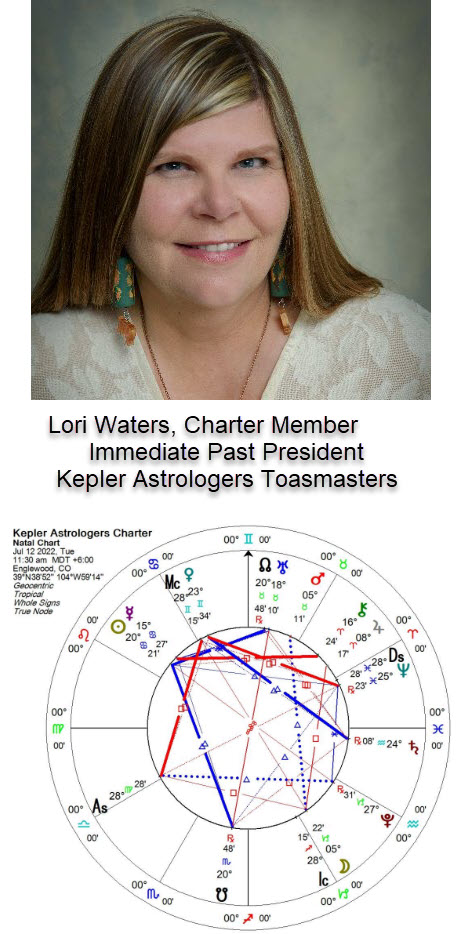 It’s not surprising that nurturing is a perfect keyword for our group as we were chartered under a Cancer sun and Mercury. Though the time we were entered into the Toastmaster International system can be debated, there is some agreement on 11:30 a.m. Mountain July 12, 2022 as our Charter chart. That time gives us a Virgo ascendant, which makes sense for a group that is focused on perfecting the art of communicating astrological knowledge. We were founded the day before the full moon, with that ultimate waxing gibbous (gibbus) moon dripping with potential. But with that moon being in Capricorn in the 5th house, there is an emphasis on hard work and discipline to achieve our creative goals. Opposite that moon is our sun in Cancer in the 11th house of social groups. The organizing force of this group from its magical inception has been one of nurturing and support. Hard work is expected but easier to be pushed toward when we know we have a family supporting our growth. Within our protective structure, members are encouraged and supported to practice impromptu as well as scripted speaking.